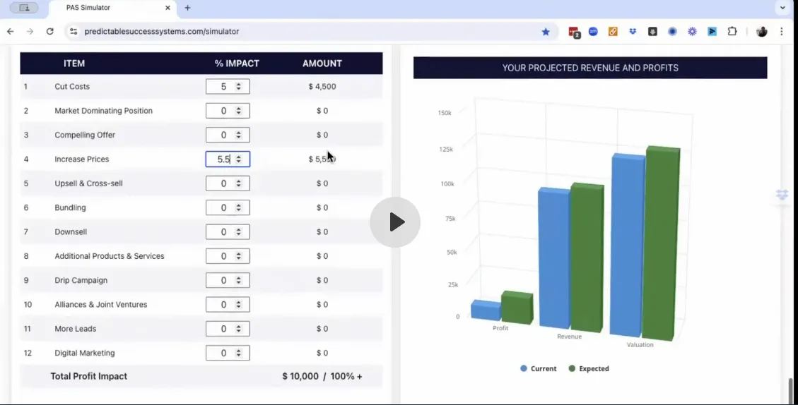 Inside your course, you’ll use the Profit Acceleration Simulator to quickly test small changes in pricing, conversions, costs, or transactions.